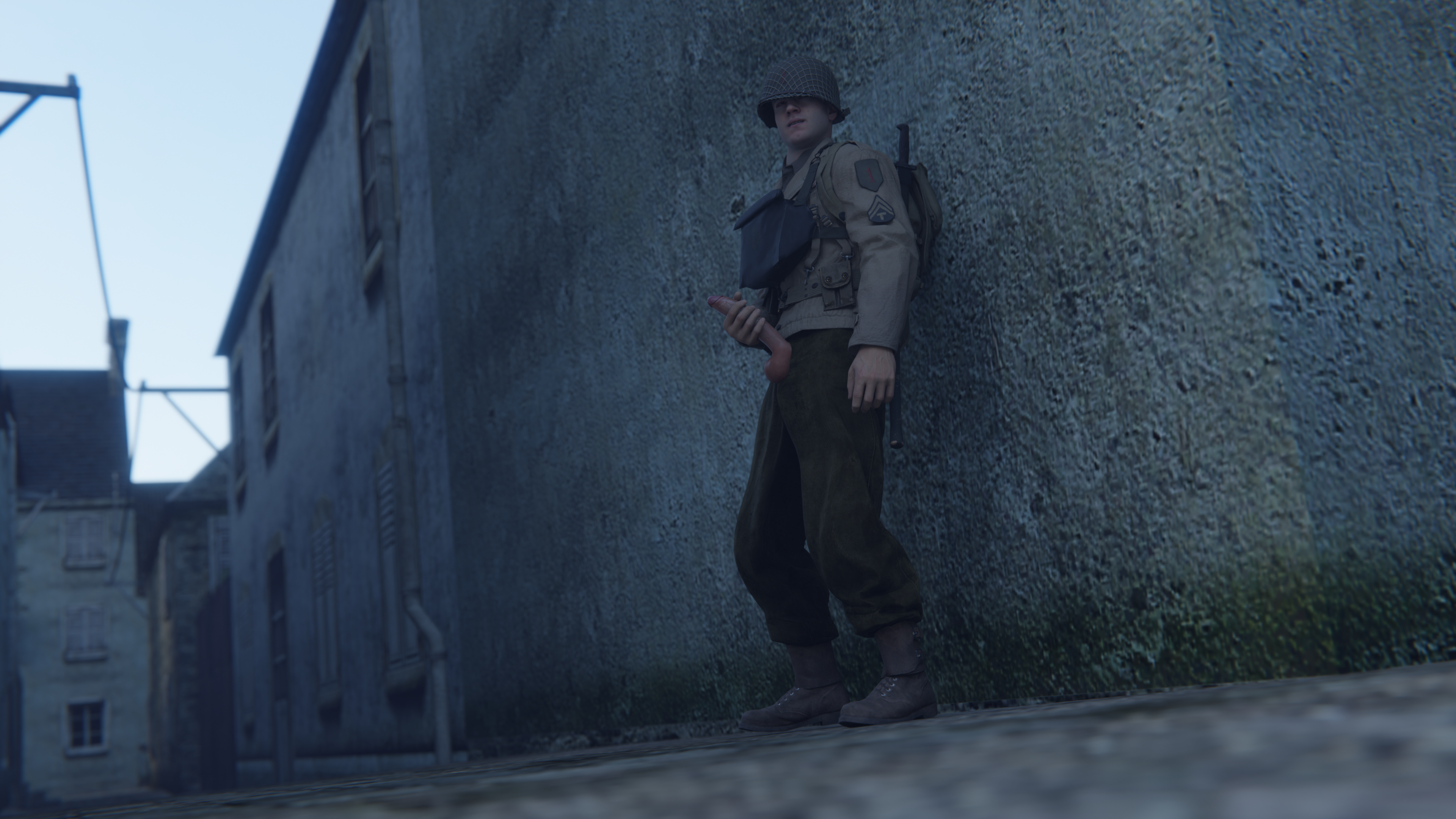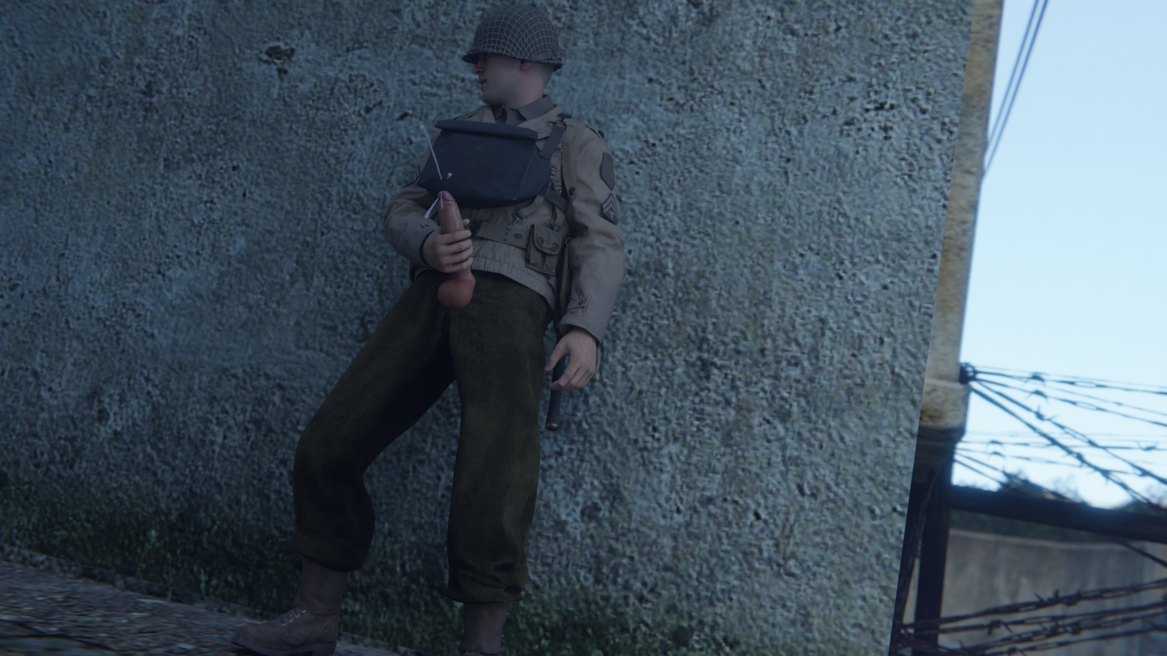 A walking-by soldier used the discreet wanking infantryman as an opportunity for his own pleasure...
