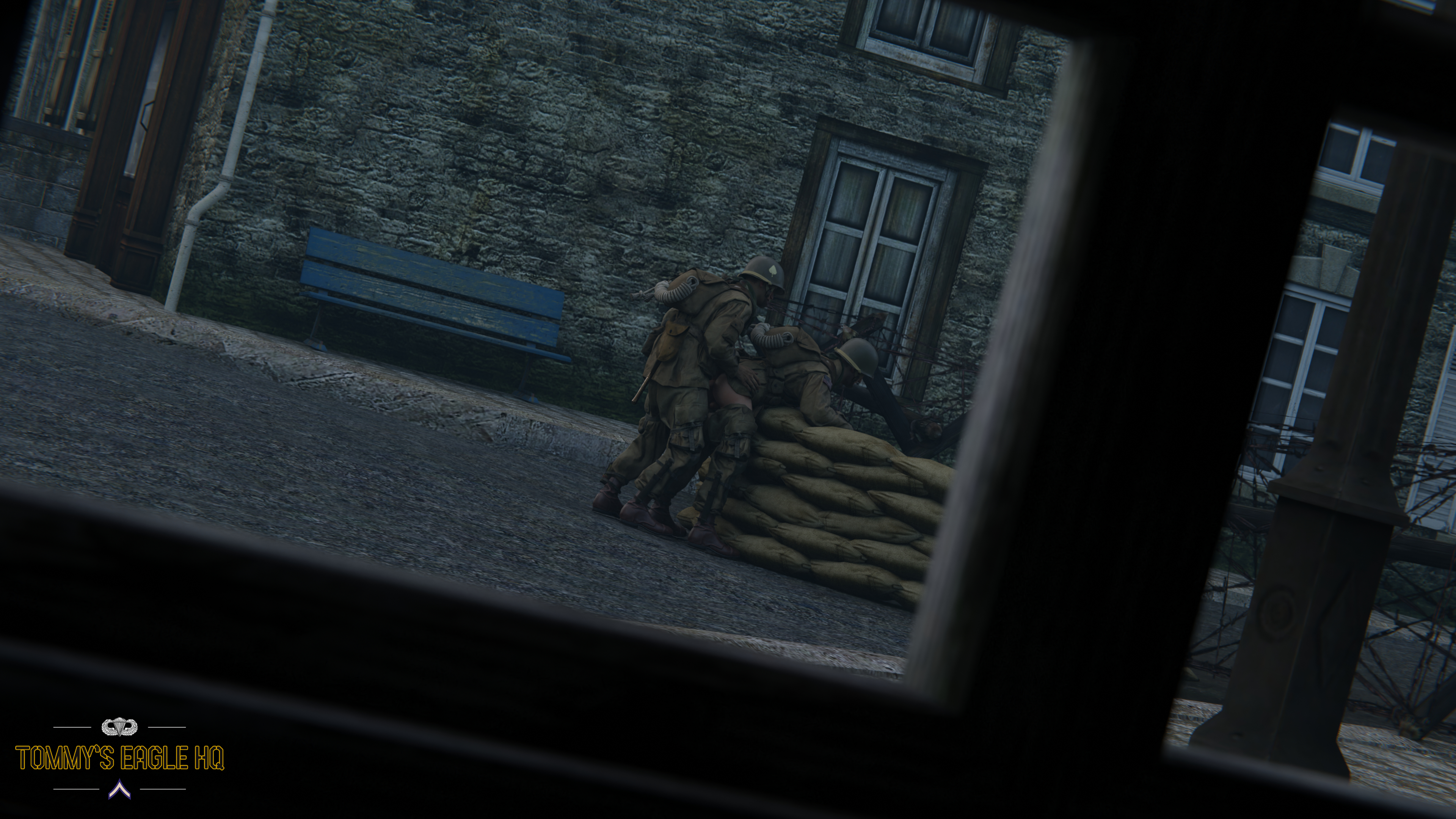 With no shame, the troopers take care of their needs even in the middle of the liberated town...